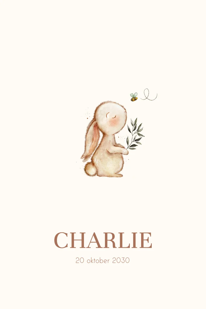 Een geboortekaartje met een schattig konijntje en een bijtje. Pas het geboortekaartje gemakkelijk aan naar je eigen wensen in onze editor.