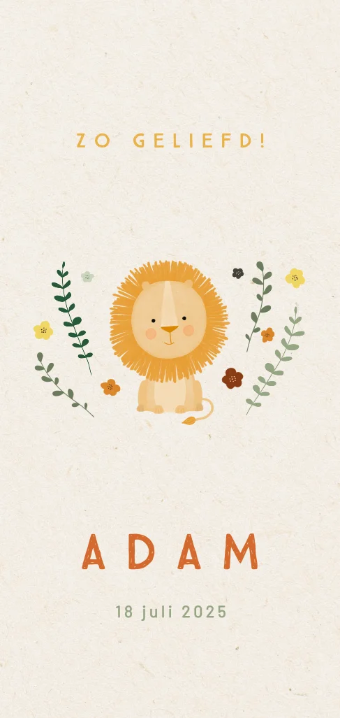 Grappig beige geboortekaartje voor een jongen, een lief leeuwtje staat tussen de vrolijk gekleurde bloemetjes, de naam staat in roodbruine stoere letters eronder. Op de achterkant kijkt het leeuwenwelpje om de hoek, maak het kaartje persoonlijk in de online editor en bestel een proefdruk.