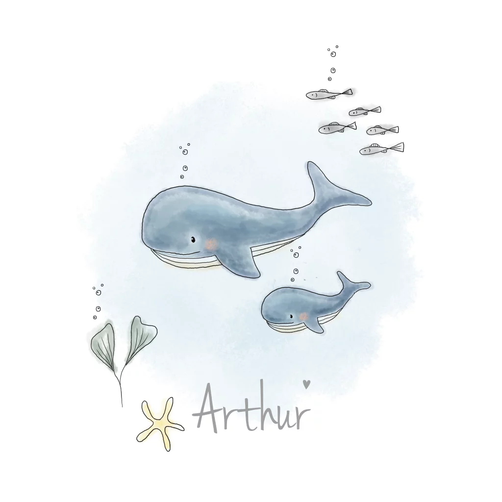 Schattig geboortekaartje met tekening van walvis in oceaan