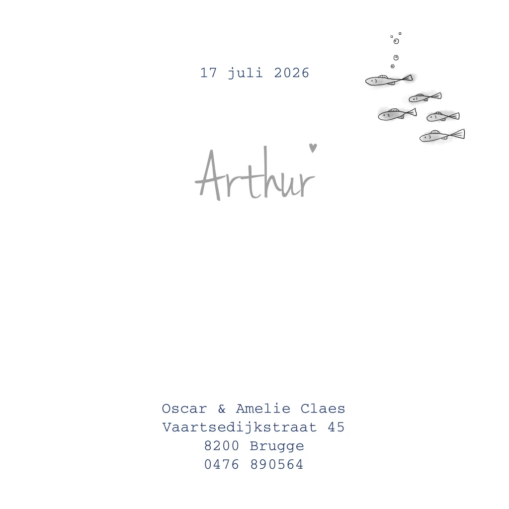 Lief geboortekaartje voor een jongetje. Een moeder walvis is heerlijk aan het zwemmen samen met haar kleine in de blauwe oceaan. Op de achtergrond een school visjes, plantjes en een zeester. Ook aan de binnenzijde is het kaartje in deze stijl geïllustreerd. Wist je dat je eenvoudig zelf de naam en tekst kunt aanpassen in de online editor? Zo gedaan!
