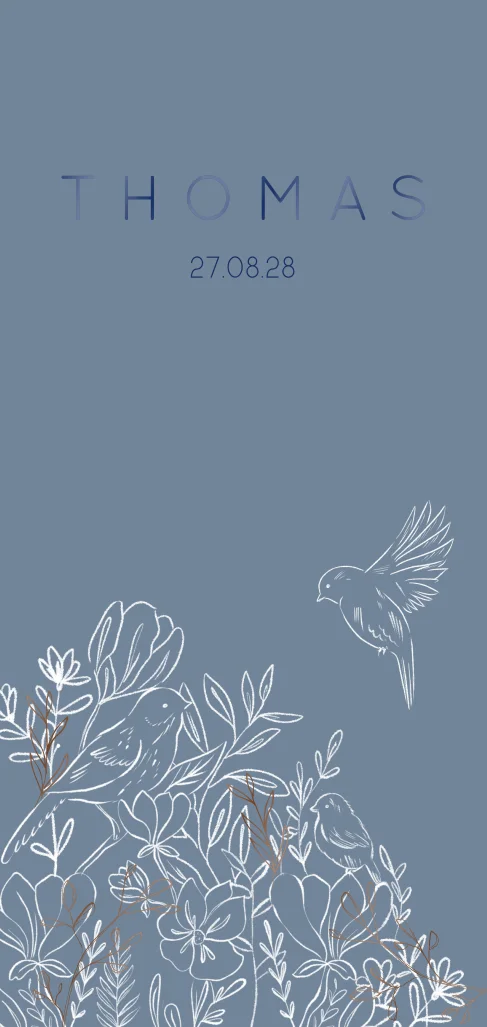 Een langwerpige, elegante geboortekaart voor jullie kleintje. De naam staat in hoogglans bovenaan. De getekende bloemen, takjes en vogeltjes geven dit kaartje een sierlijke uitstraling.