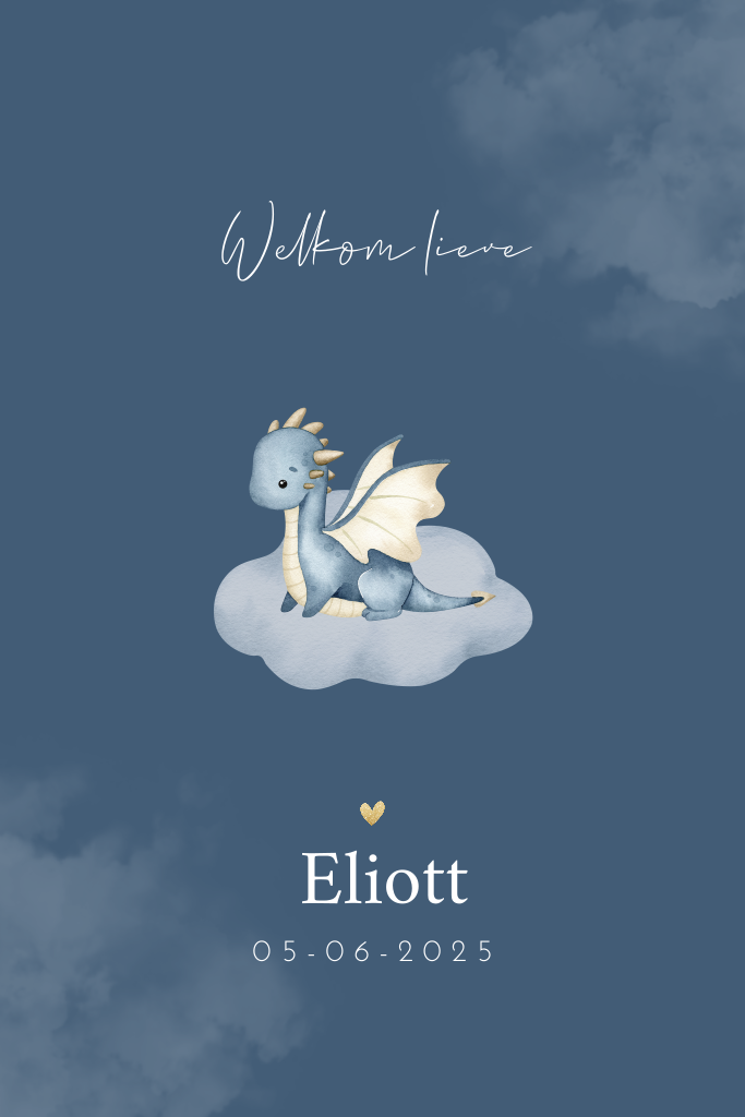 Schattig geboortekaartje met een donkerblauwe achtergrond en wolkjes. Voorop het geboortekaartje staat een lief draakje die op een wolk zit. De naam en andere teksten staan in goudfolie gedrukt.