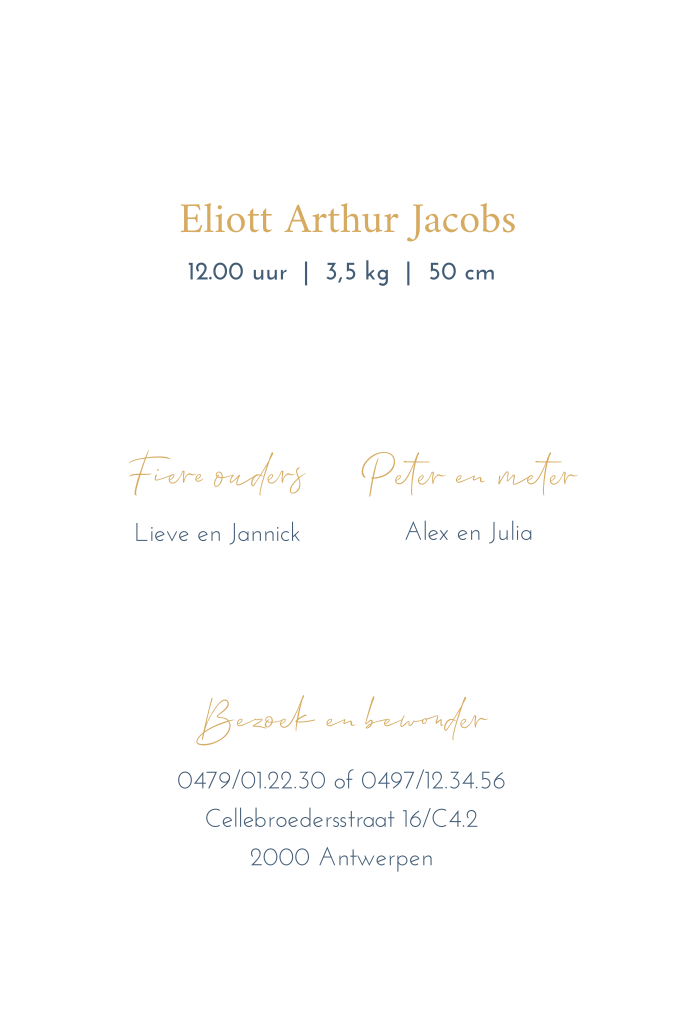 Schattig geboortekaartje met een donkerblauwe achtergrond en wolkjes. Voorop het geboortekaartje staat een lief draakje die op een wolk zit. De naam en andere teksten staan in goudfolie gedrukt.Totaalprijs: 0 |
