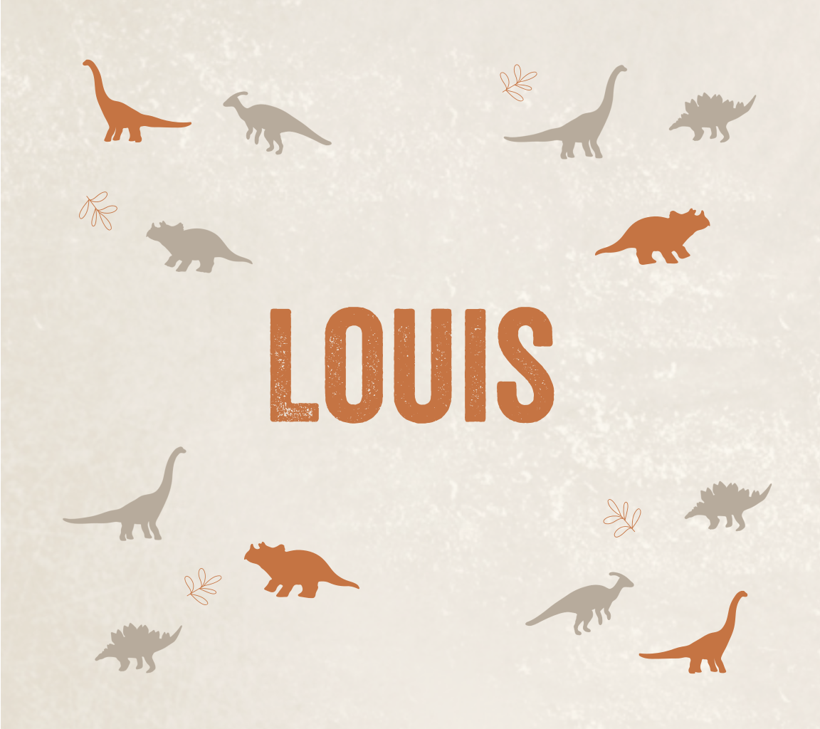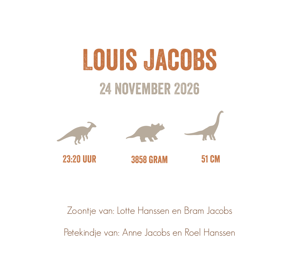 Dit kaartje is perfect voor ouders die een stoere geboortekaart zoeken voor hun pasgeboren kleintje. De naam staat groot in het midden en wordt omringt door verschillende dino's.