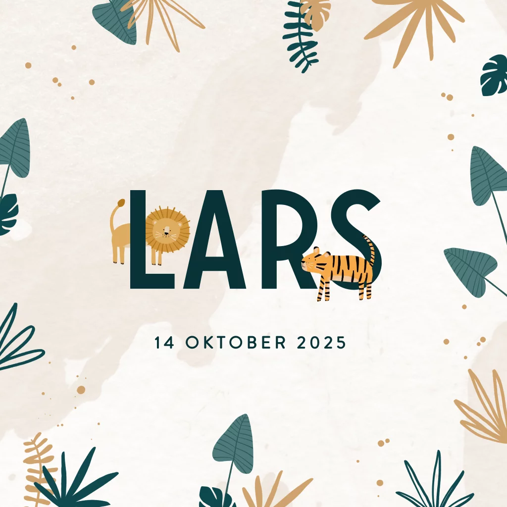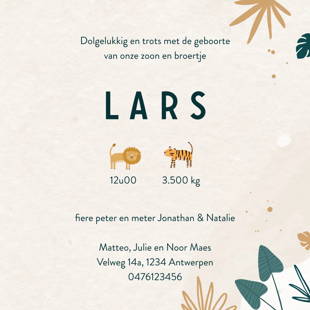 Een stoer geboortekaartje in jungle thema voor de geboorte van je kindje. Het geboortekaartje heeft bij de naam een leeuwtje en tijgertje staan.