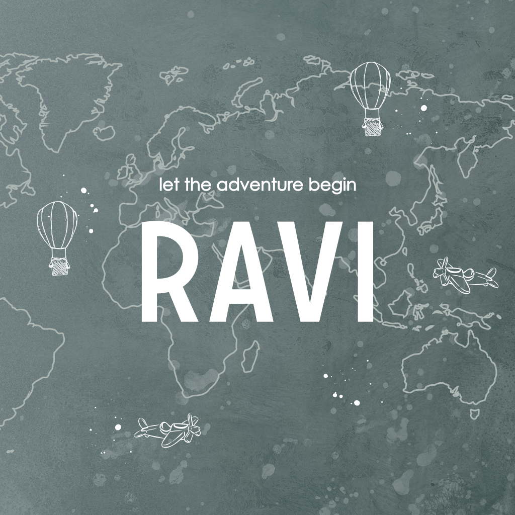 Vierkant geboortekaartje met een wereldkaart, luchtballonnen en een vliegtuig. De naam is van goudfolie.Totaalprijs: 0 |