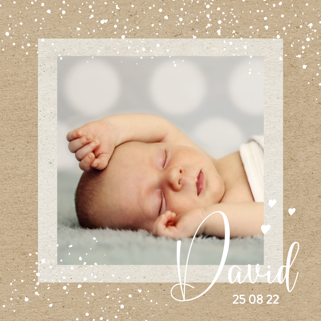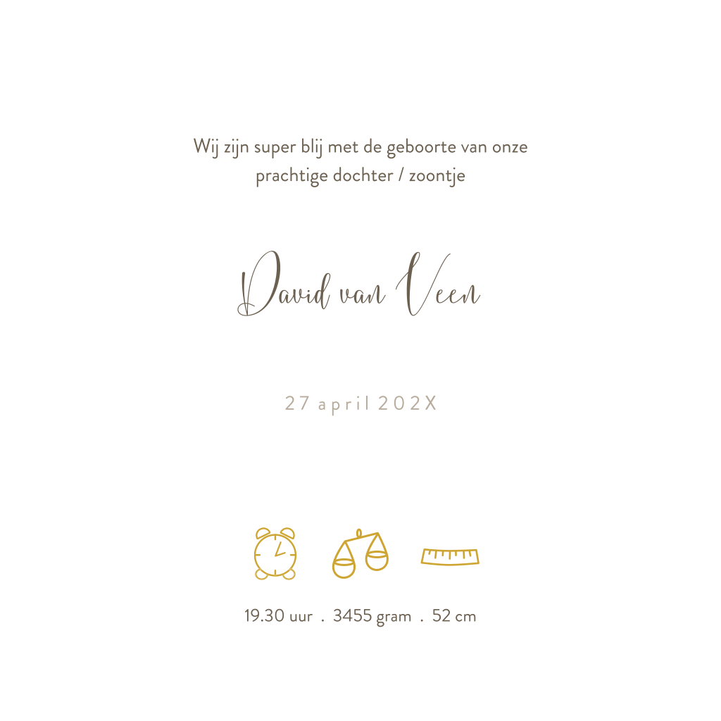 Een hip babykaartje met de foto van jullie zoontje of dochtertje! Op deze geboortekaart zijn de naam, hartjes en confetti van stipjes in goudfolie gedrukt, deze zijn ook terug te vinden op de achterzijde van het kaartje. Aan de binnenzijde staan leuke symbooltjes bij de tekst, deze kun je zelf eenvoudig aanpassen in de online editor.