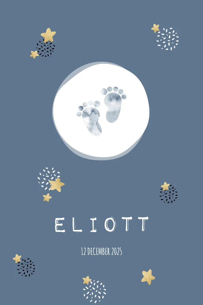 Trendy geboortekaartje voor jullie zoontje in jeansblauw met afgeronde hoeken. Onder de witte cirkel met kleine blauwe voetjes staat de naam van jullie kleine in een hip lettertype. De sterretjes en stipjes op de achtergrond maken het kaartje helemaal af.Bekijk ook ons bijpassende babyborrelkaartje.