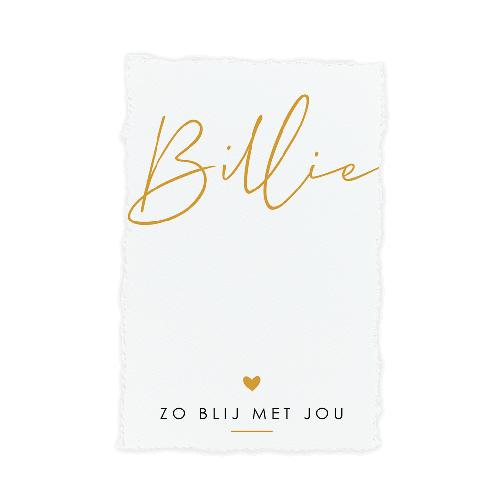 Neutraal geboortekaartje met de naam in sierlijke letters en een lief hartje erbij. Pas het kaartje naar wens aan met eigen tekst in onze online editor.