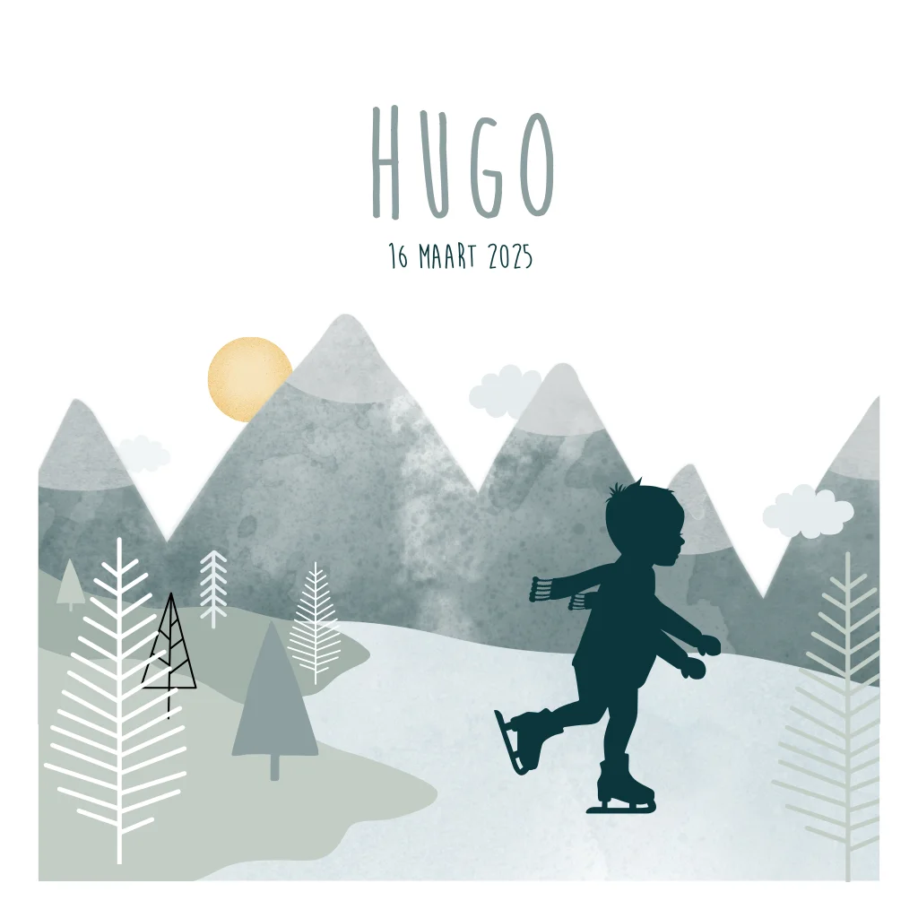 Als jullie zoontje in de winter wordt geboren dan is dit kaartje met het schaatsende jongetje perfect! Het landschap met bergen en boompjes is in verschillende grijstinten, op de achtergrond nog een klein zonnetje.