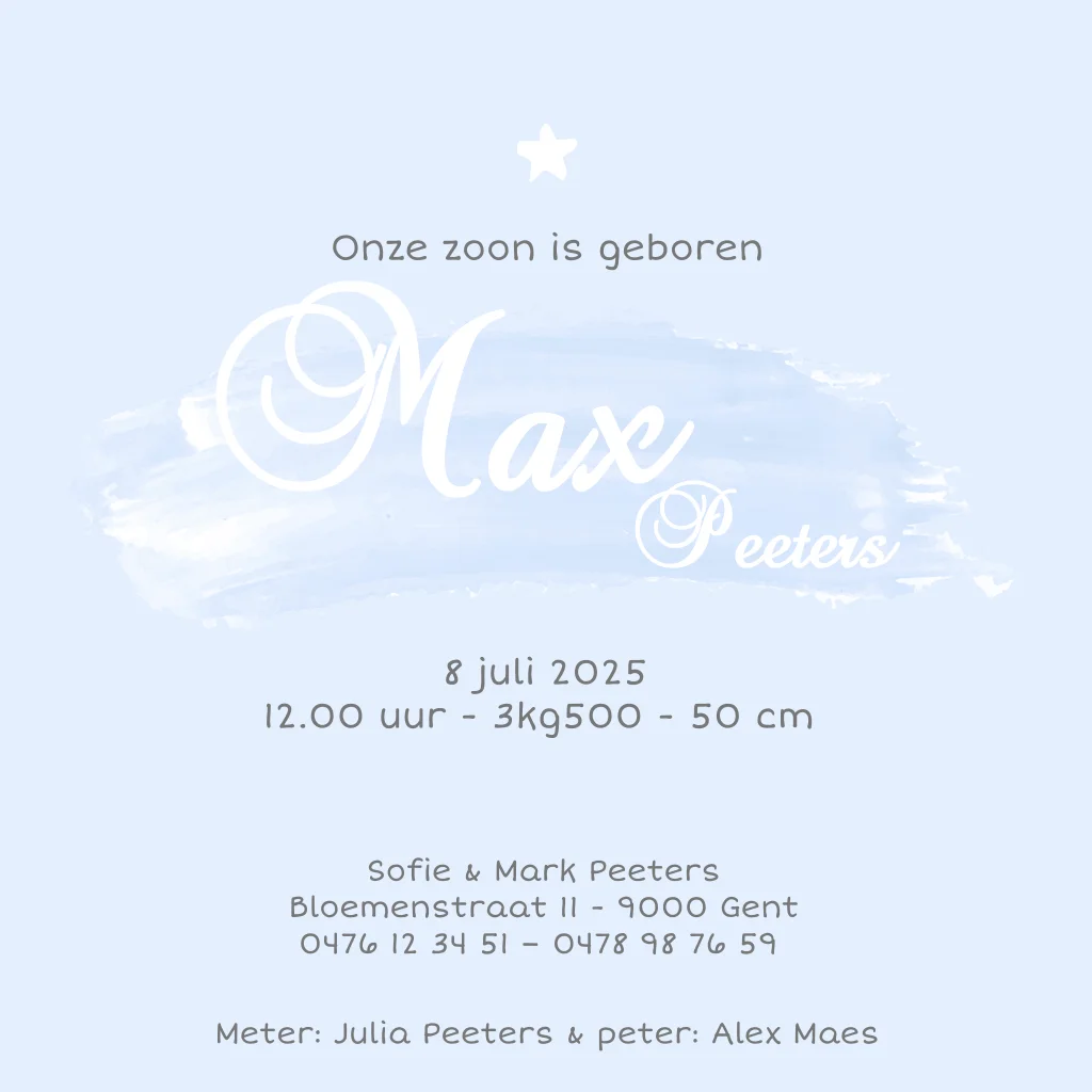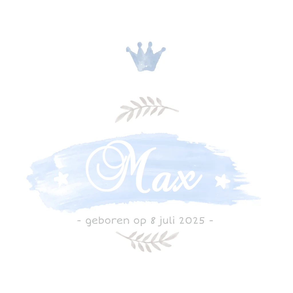 Lief geboortekaartje voor jullie zoontje met lichtblauwe waterverf, zilverlook takjes en een klein kroontje. De naam van jullie kleine staat in sierlijke letters en is in zilverfolie gedrukt, voor een extra mooie look. De kleine sterretjes maken het kaartje helemaal af!