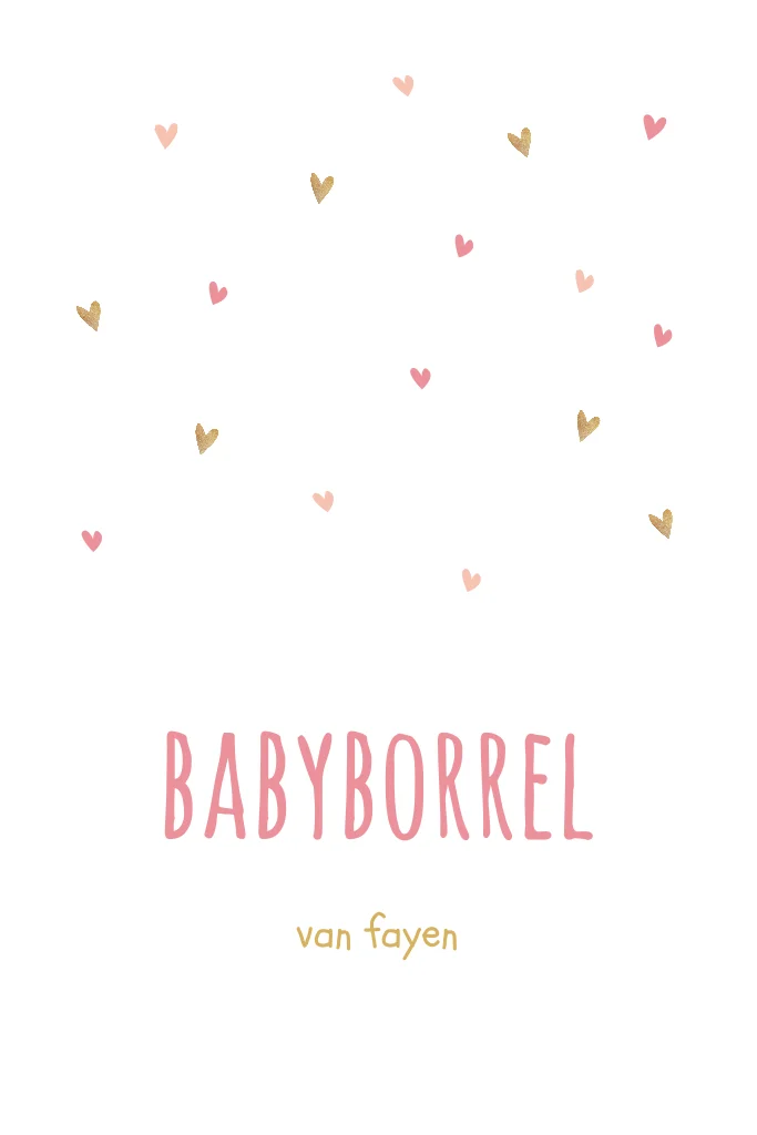 Lieve uitnodiging voor de kraamborrel van je dochtertje met schattige zacht roze en goudlook hartjes. Leuk idee: verstuur dit kaartje bij de bijpassende geboortekaartjes!