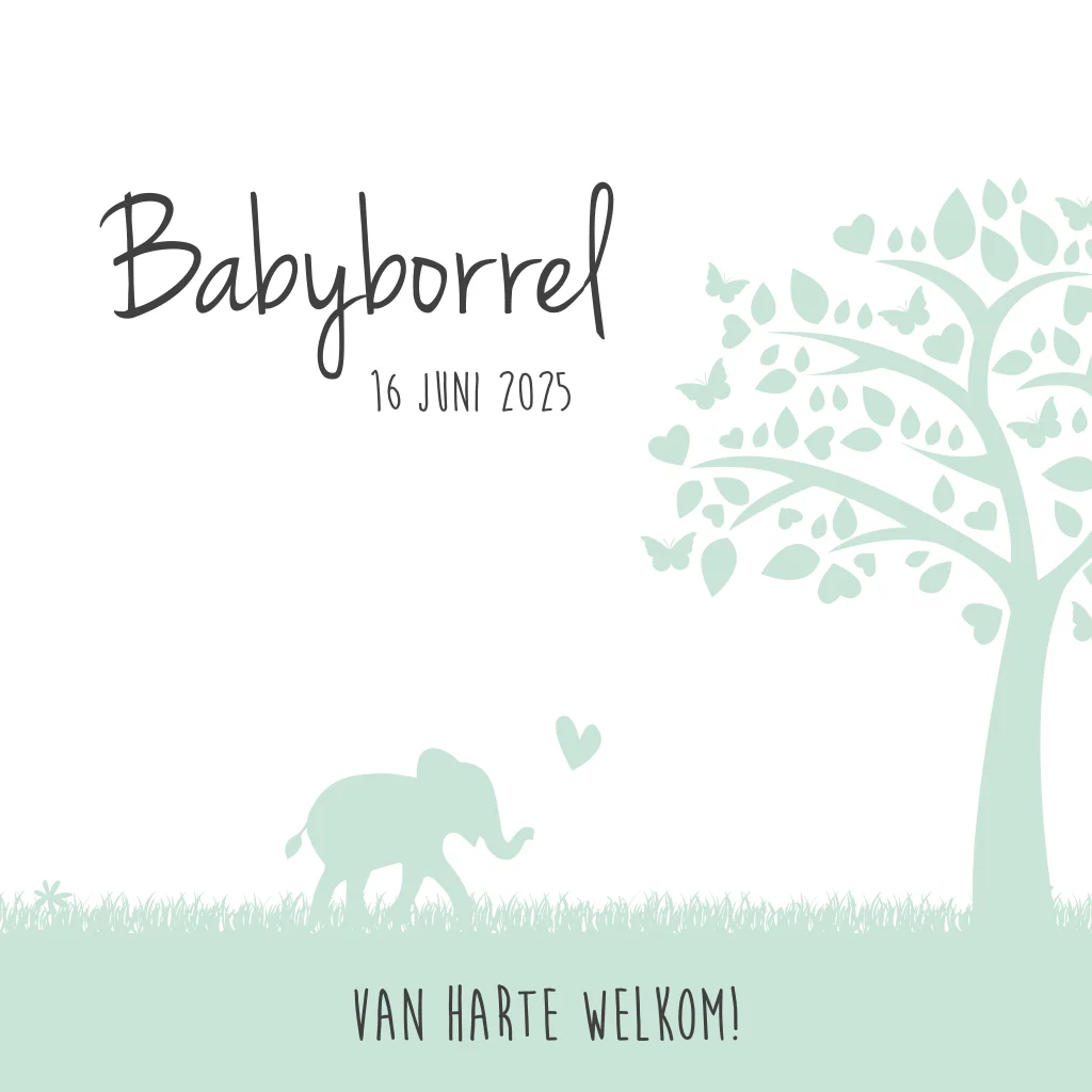 Ontzettend lieve kraamborrel uitnodiging met een silhouet van een olifantje en een boompje in mintgroen. Verander de kleuren, teksten en lettertypes en maak zo de kaart naar je eigen smaak!Heb je ook het bijpassende geboortekaartje al gezien?