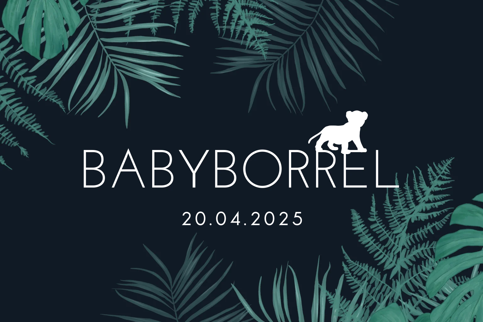Mooie uitnodiging voor een babyborrel in jungle thema. Op de donkere achtergrond komen het welpje en de letters in goudfolie mooi naar voren. Aan de rand staan groene takken.