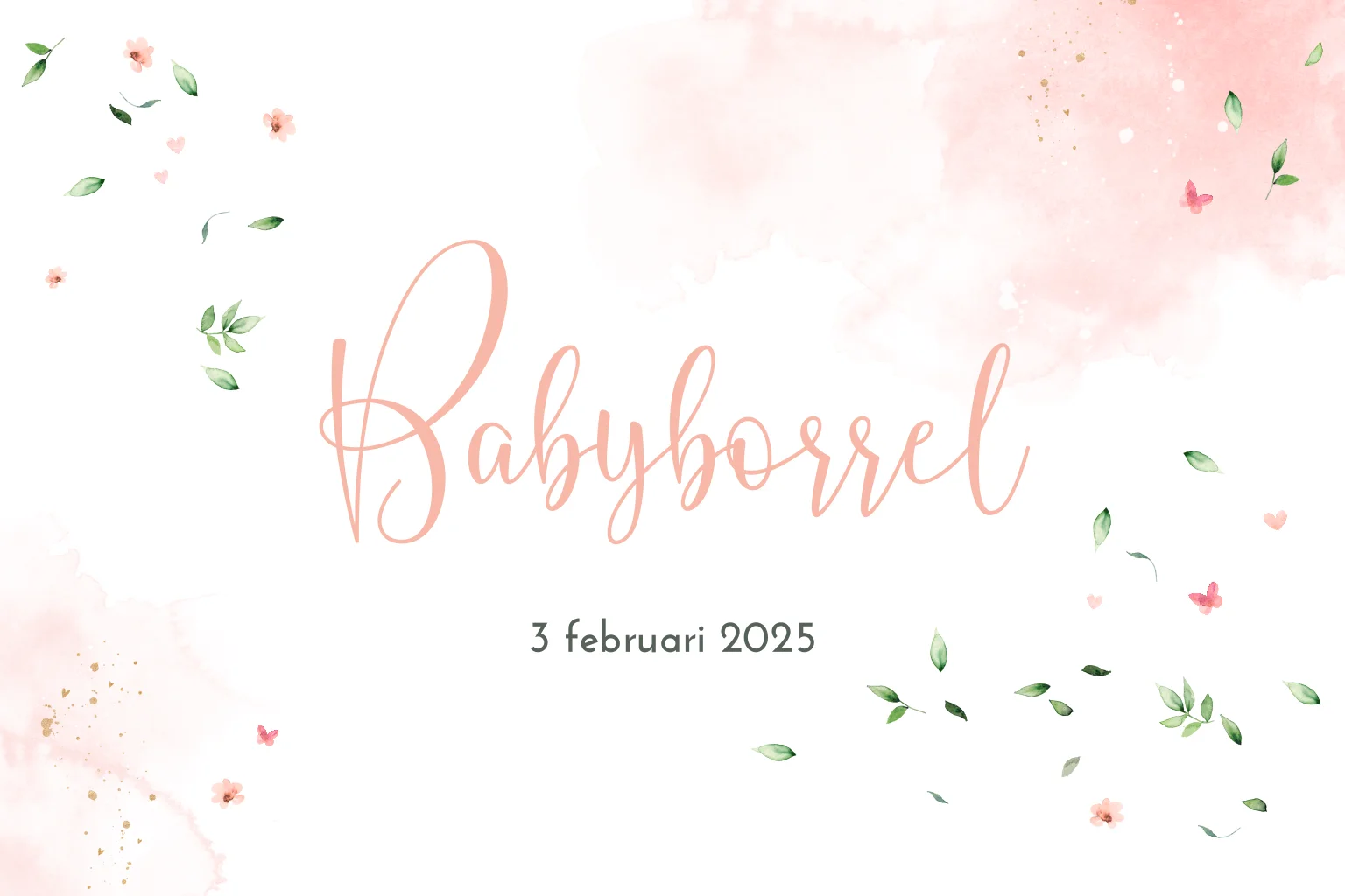 Lief babyborrelkaartje met roze watercolour. Met de kleine vlindertjes en blaadjes in de hoeken is dit liggende kaartje heel leuk voor een dochter. Pas het ontwerp eenvoudig aan in de online editor.