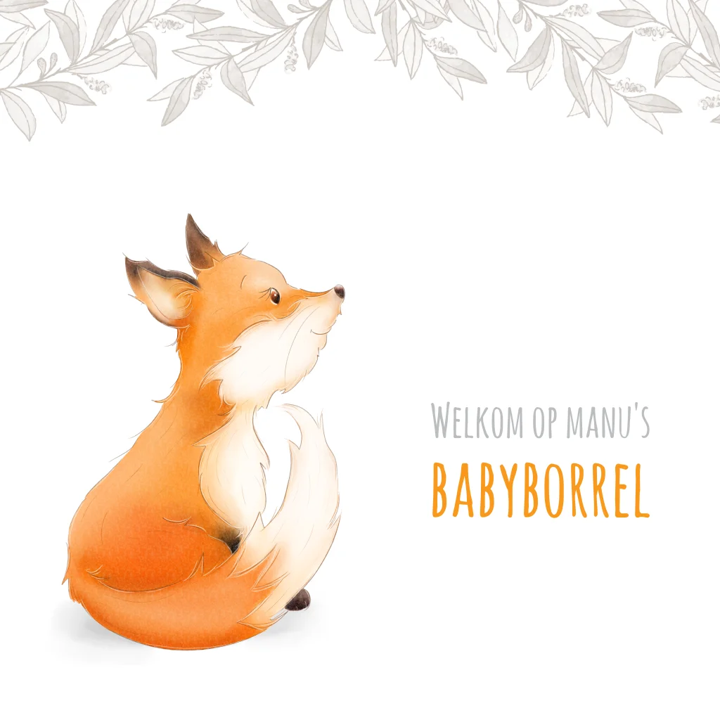 Trendy uitnodiging voor een babyborrel met een lief vosje en getekende blaadjes aan de bovenrand.Bekijk ook ons bijpassende geboortekaartje.