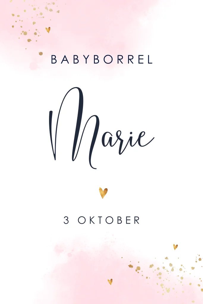Babyborrelkaartje met watercolour achtergrond en kleine gouden hartjes.Plaats zelf de teksten en elementen eenvoudig op de juiste plek in onze opmaaktool. Heb je hier hulp bij nodig? Neem gerust even contact met ons op!