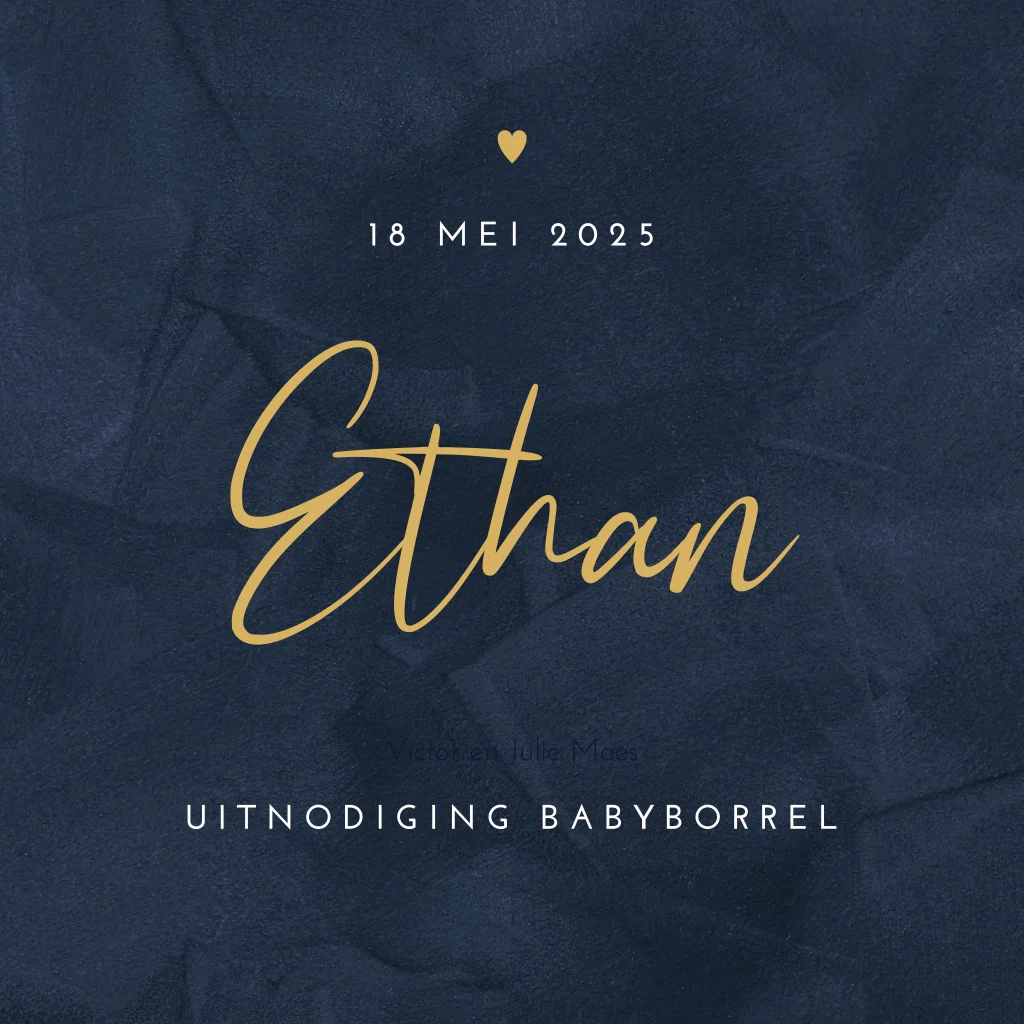 Uitnodiging babyborrel uitgevoerd in donkerblauwe velvet-look en een hartje en tekst in goudfolie.Bekijk ook ons geboortekaartje.
