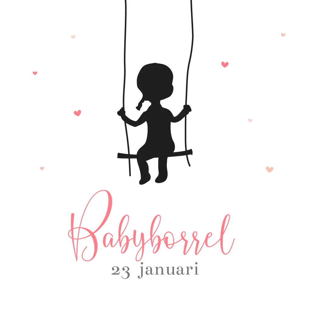 Gaan jullie een kraamborrel geven om je pasgeboren dochter te laten bewonderen door je vrienden, familie of collega's? Nodig met dit kaartje je gasten uit en laat ze weten op welke locatie en tijdstip de borrel plaats zal vinden. Dit is echt een hip kaartje met een zwart silhouet van een meisje op een schommel en roze hartjes op de achtergrond.