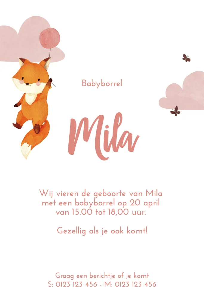 Een lief babyborrelkaartje om vrienden en familie uit te nodigen om jullie dochtertje te bewonderen. Het kaartje is van biotop papier wat een off-white papiersoort is. Op het kaartje staat een lief vosje die vliegt aan een roze ballon tussen de roze wolken.Het babyborrelkaartje past bij dit originele geboortekaartje.