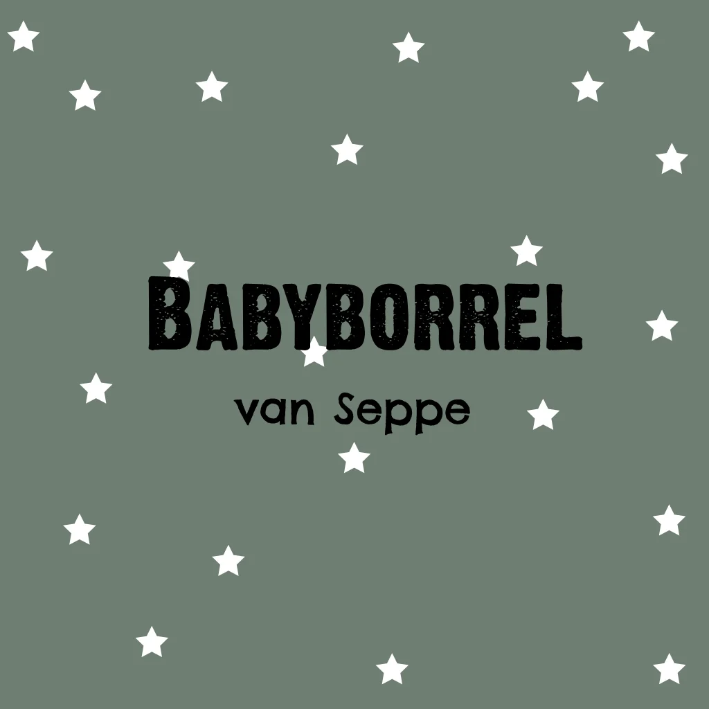 Hippe babyborrel kaart om je gasten uit te nodigen om beschuit met muisjes te eten en de kleine man te komen bekijken! Een stoere kaart met witte sterretjes op een legergroene achtergrond. Pas de teksten aan naar persoonlijke wens in de editor en de uitnodiging is klaar voor verzending.