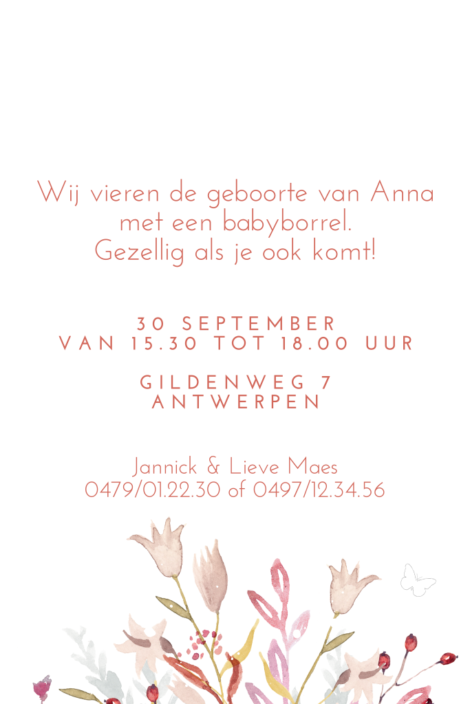 Lief babyborrelkaartje staand model in roze en oranje kleuren en hartjes. Onderaan een bloemenrand met een vlindertje.Heb je ook het bijpassende geboortekaartje al gezien?