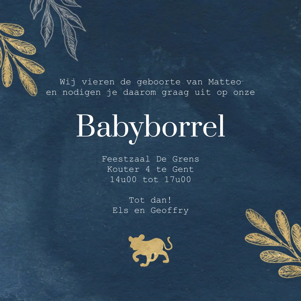Modern babyborrelkaartje met botanische elementen op een donkere achtergrond. Met goudfolie.Plaats zelf de teksten en elementen eenvoudig op de juiste plek in onze opmaaktool. Heb je hier hulp bij nodig? Neem gerust even contact met ons op!