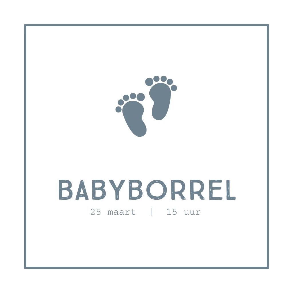 Classic uitnodiging voor een babyborrel in het wit met grijsblauwe details. In het blauwe kader staan twee kleine voetjes en de tekst in hip lettertype. Pas zelf eenvoudig de tekst en de kleuren aan in de online editor.