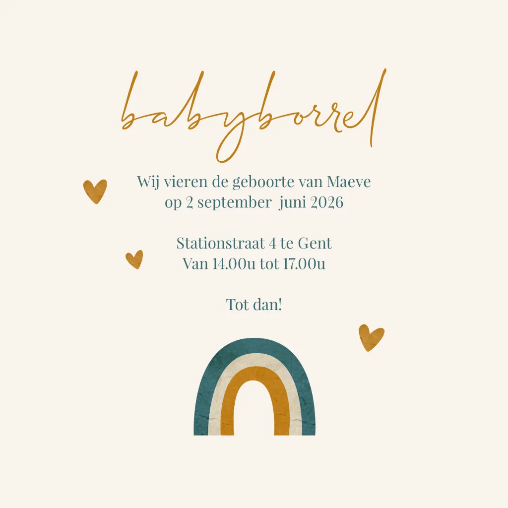Trendy uitnodiging voor het kraamfeest na de geboorte van jullie kleintje. Op een pastelkleurige achtergrond staat dezelfde regenboog in petrol en oker als op het geboortekaartje, ook hier weer kleine hartjes erboven.