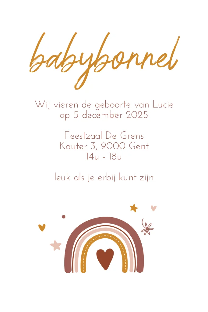 Trendy babyborrelkaartje met regenboog, sterren en hartjes. Nodig je dierbaren uit om je kindje te komen bewonderen met dit babyborrelkaartje.