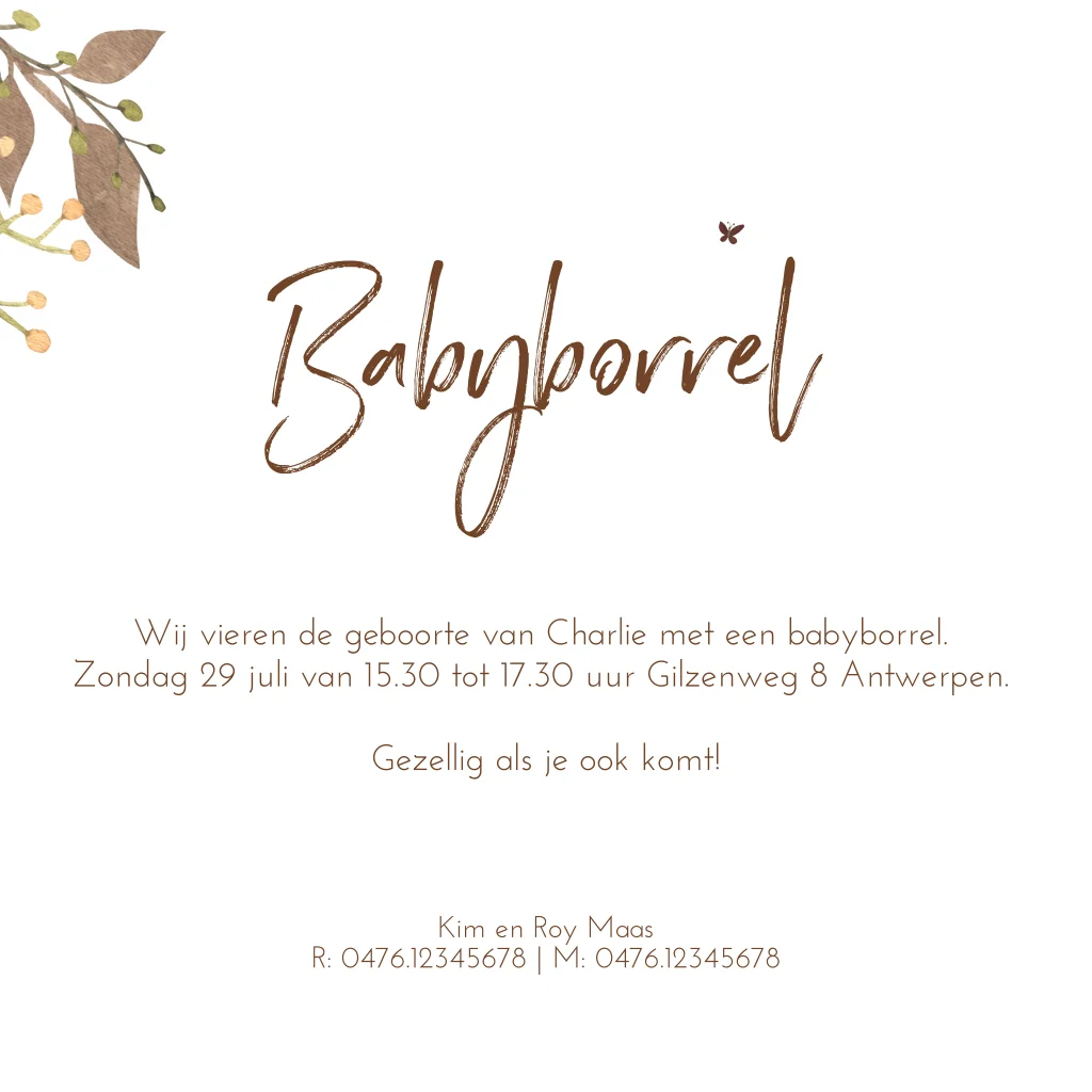 Leuke uitnodiging voor de babyborrel van jullie kindje! Pas gemakkelijk de tekst en de kleur aan in de editor.Bekijk ook ons geboortekaartje.
