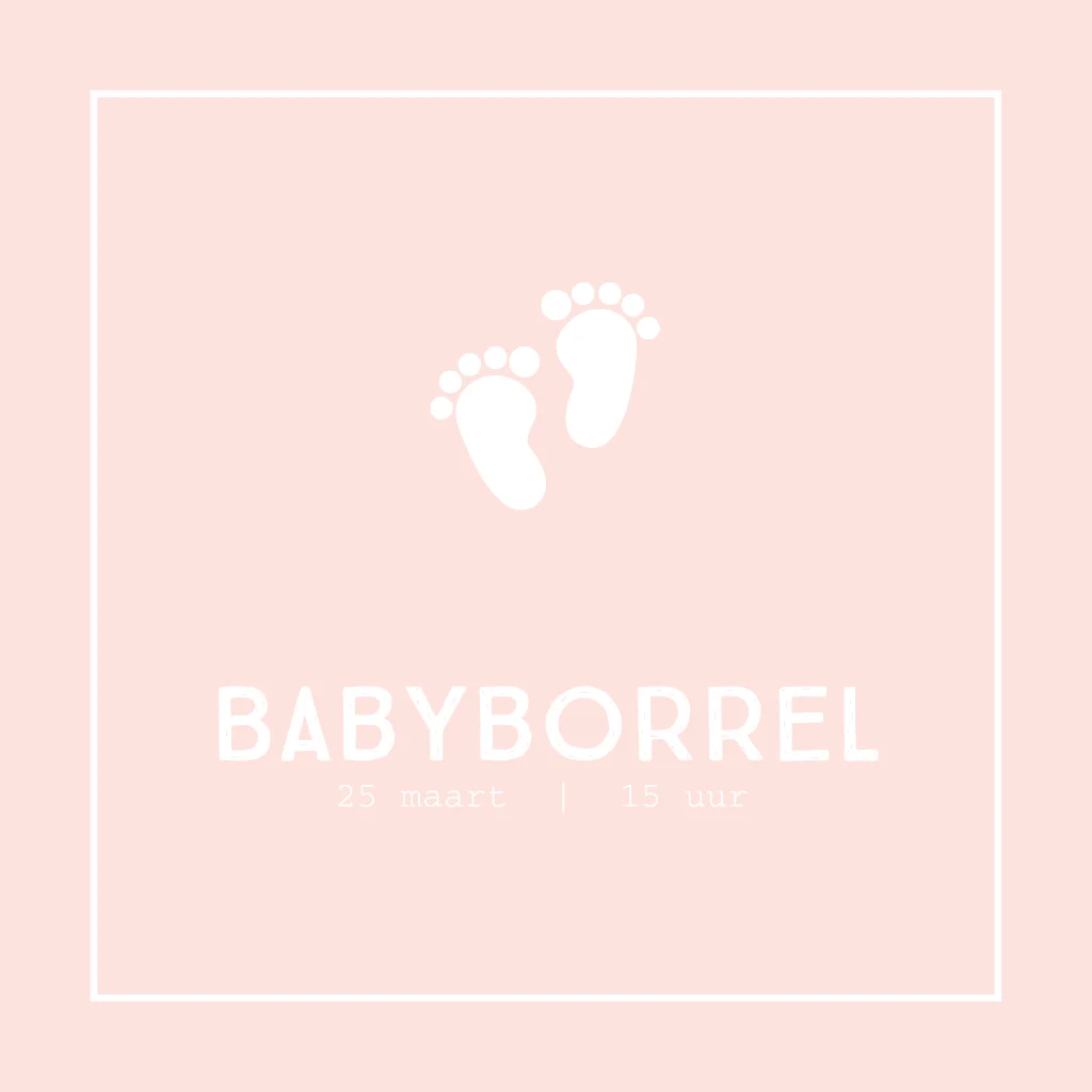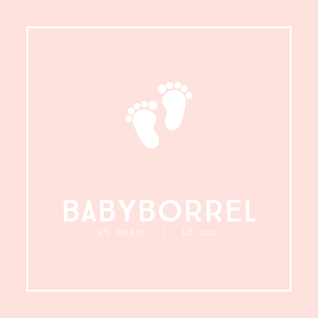 Leuk uitnodigingskaartje voor een babyborrel in lichtroze. Voorop staan witte voetjes en een dun kader langs de rand. Pas de kaart aan naar eigen wens in de online editor.