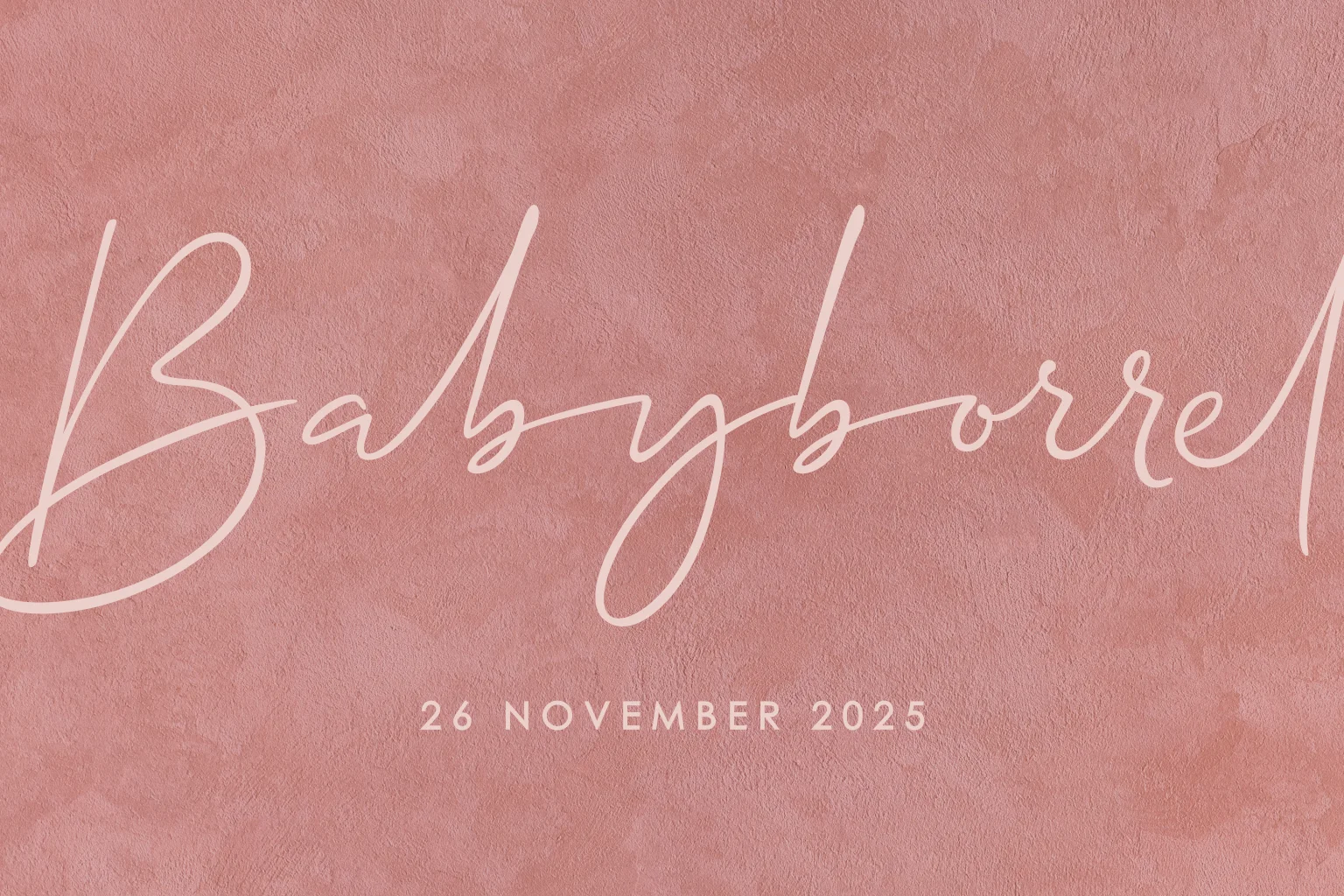 Een liggend babyborrelkaartje met een roze fluwelen achtergrond. Pas het kaartje volledig naar eigen wens aan in de editor