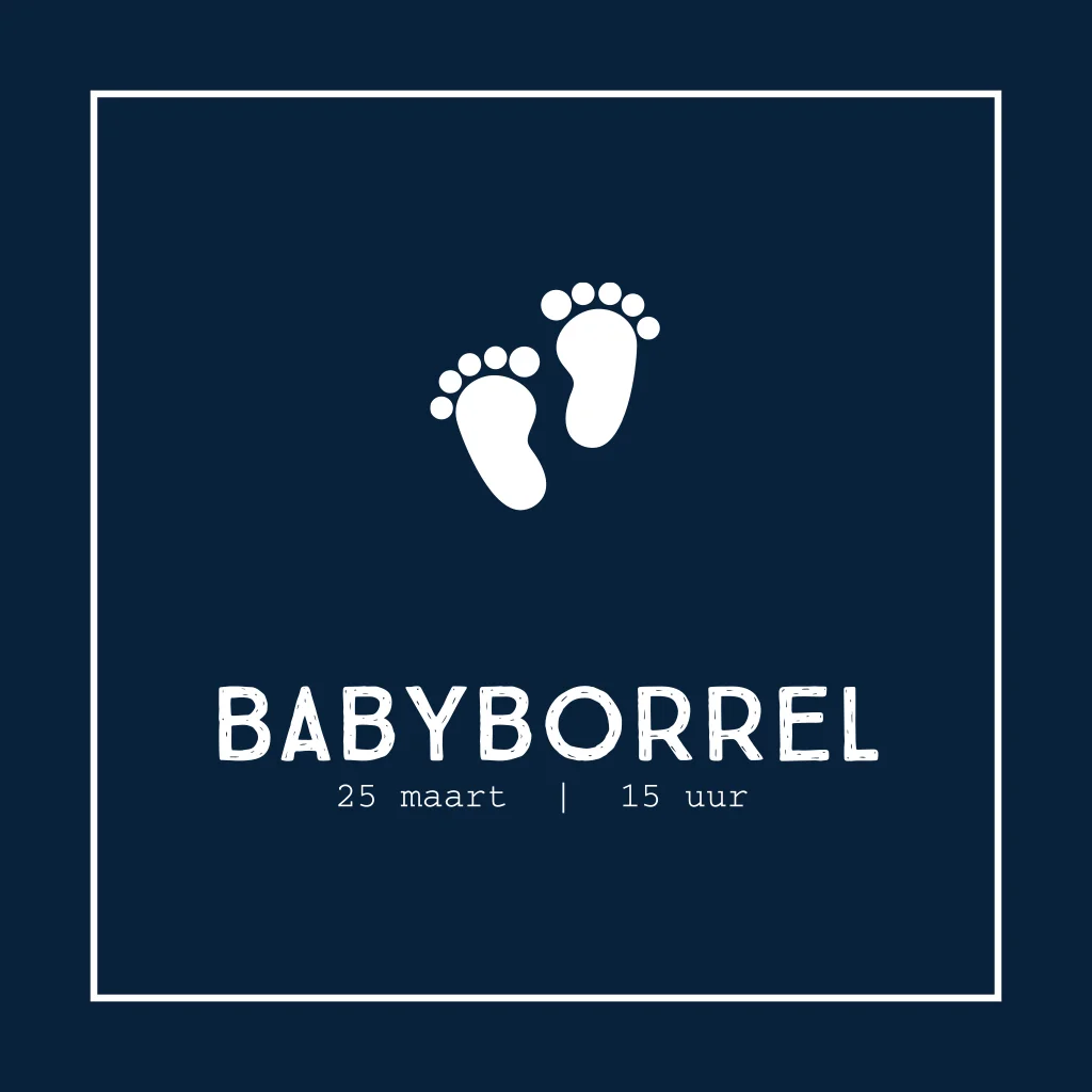 Hip uitnodigingskaartje voor een babyborrel met witte voetjes en een dun kader langs de rand. De donkerblauwe achtergrond geeft dit kaartje een stoere uitstraling. Pas de tekst eenvoudig zelf aan in de online editor.