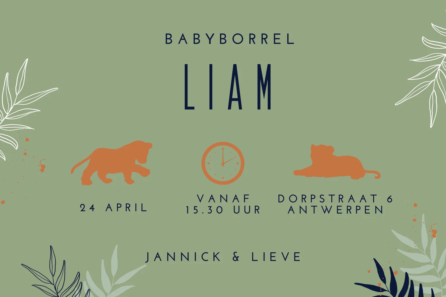 Stoere uitnodiging voor een babyborrel in junglethema.Bekijk ook ons bijpassende geboortekaartje.