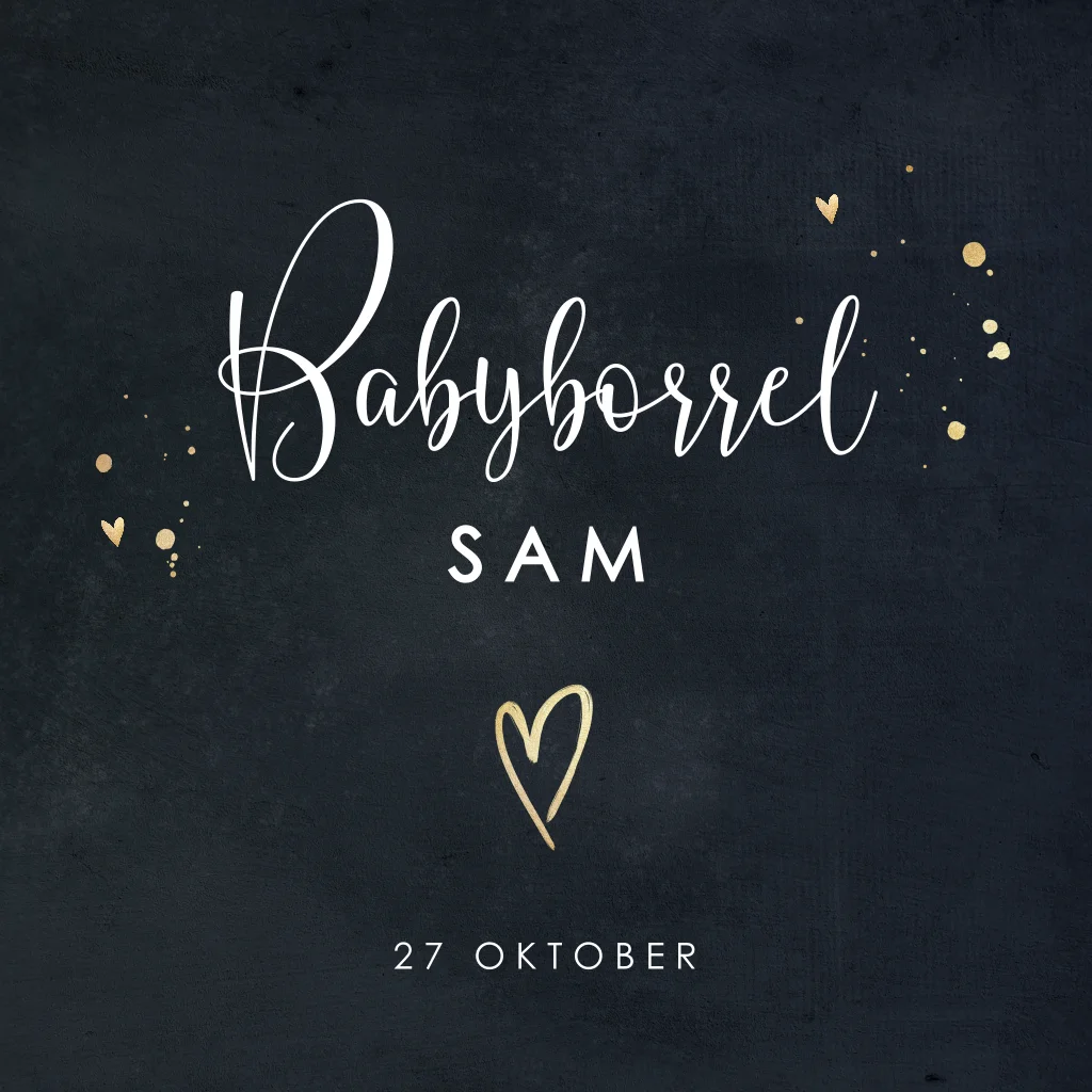 Stoere uitnodiging babyborrel met leuke typografie, die mooi naar voren komt op de zwarte achtergrond. De hartjes in goud zijn een lief accent.Bekijk ook ons bijpassende geboortekaartje.
