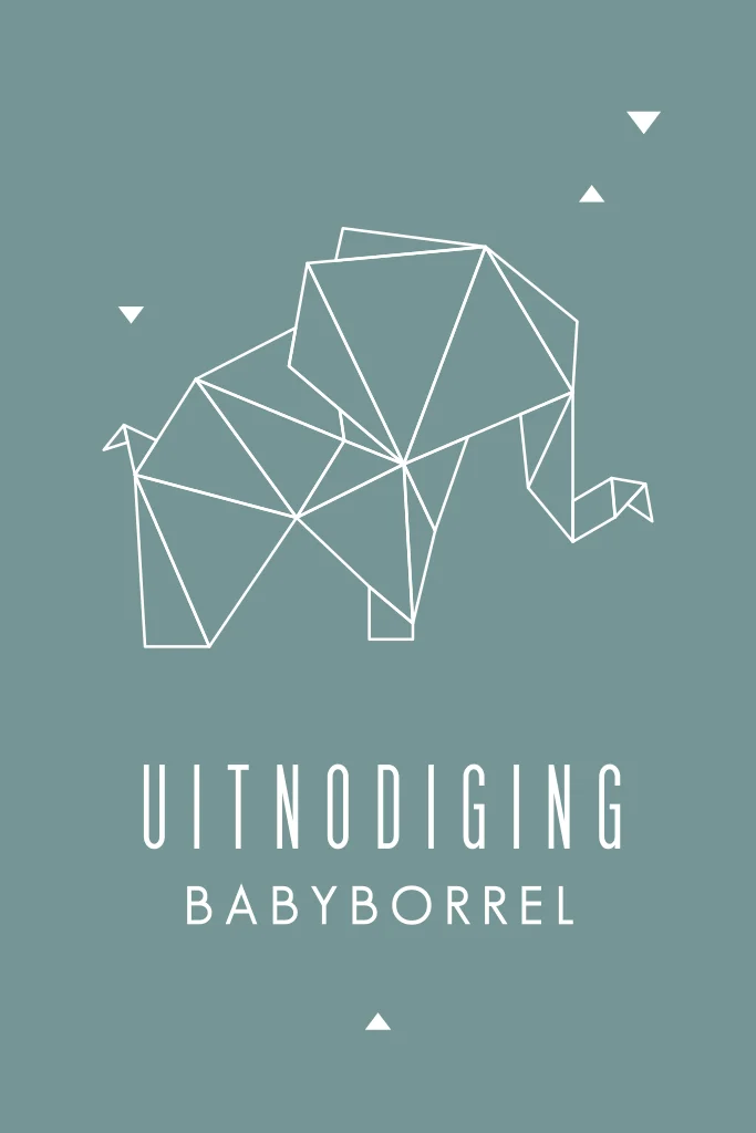 Uitnodiging babyborrel in blauwgrijs met een tekening in wit van een olifantje in geometrische lijnen met enkele hartjes erboven.