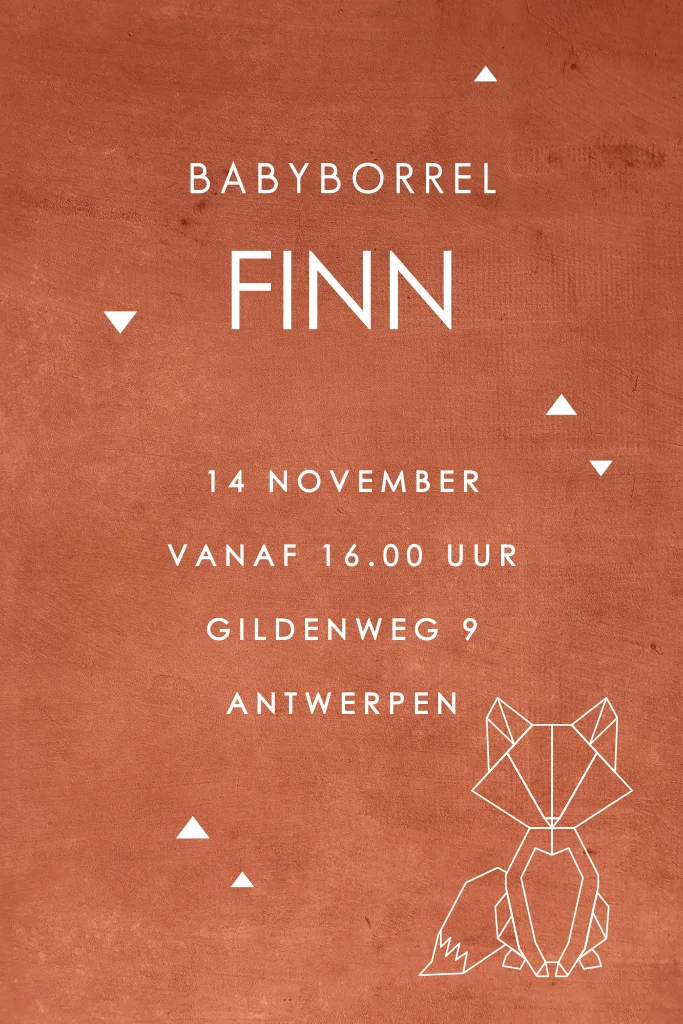 Leuke uitnodiging voor een babyborrel in roodbruine velvetlook. Het vosje in geometrische tekening en de moderne letters geven dit kaartje een hippe uitstraling.Bekijk ook ons bijpassende geboortekaartje.