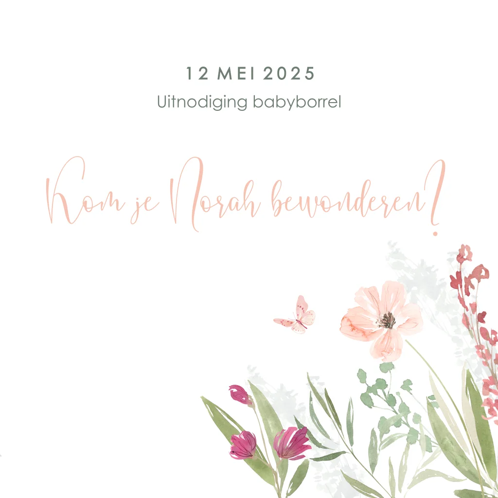 Vierkante babyborrel uitnodiging voor de geboorte van een dochter. In de hoek enkele bloemen in roze en groen.Bekijk ook ons geboortekaartje.