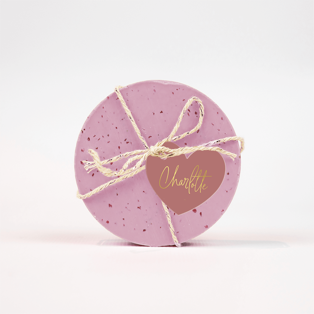 Een schattig minimalistisch labeltje in de vorm van een hartje met goudfolie. Het hartje heeft een roze achtergrond en de naam van jullie dochtertje wordt in goudfolie gedrukt.Bekijk ook het bijpassende geboortekaartje.