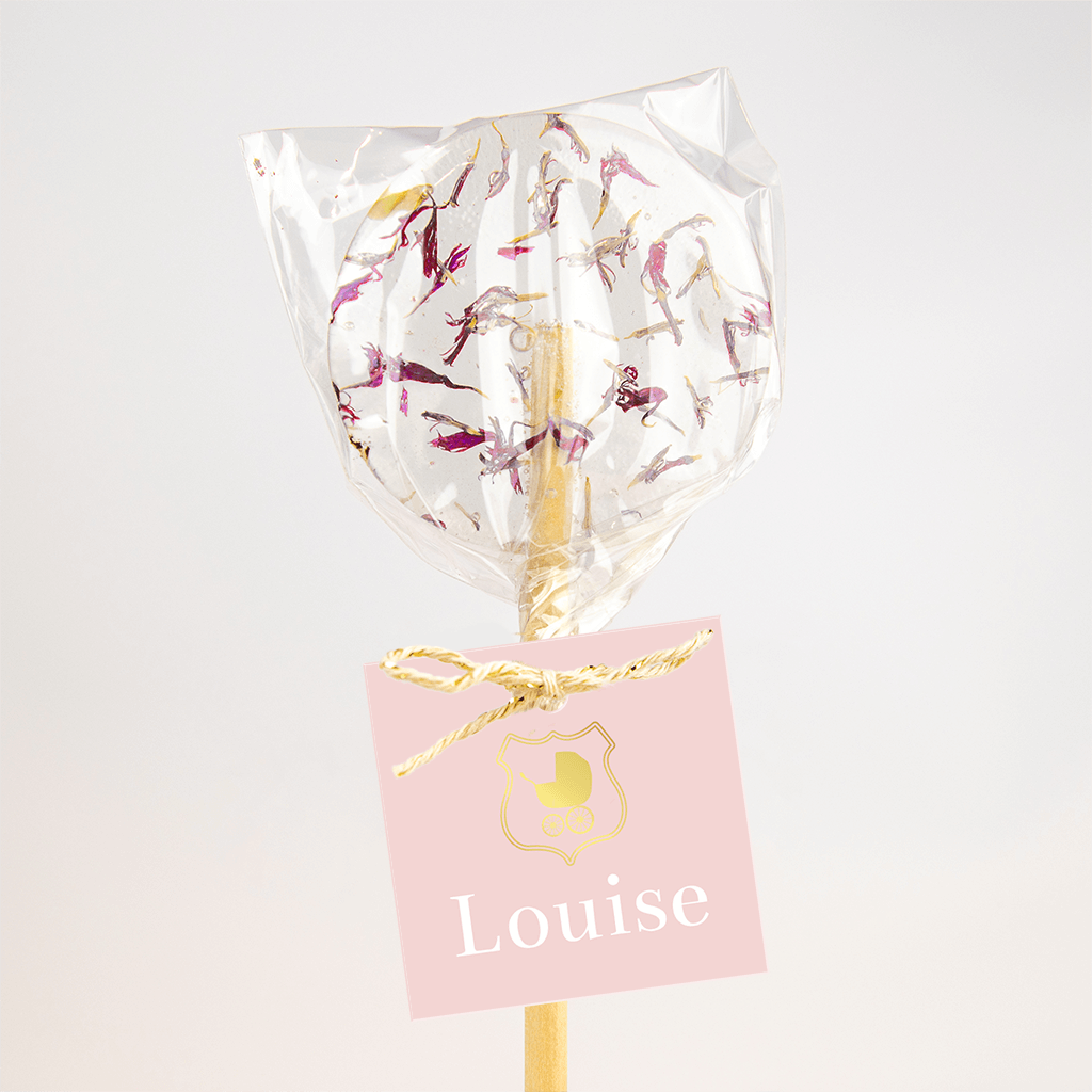 Een schattig roze labeltje met een kinderwagen. Het label heeft prachtig goudfolie accent!