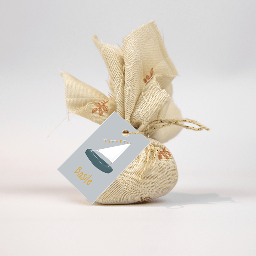 Echt een cool labeltje bij het geboortekaartje van jullie zoontje! Op de grijze achtergrond een zeilbootje in blauw en wit, de gekleurde vlaggetjesslinger maakt het helemaal vrolijk. De naam pas je eenvoudig zelf aan in de online editor voor een persoonlijk label.