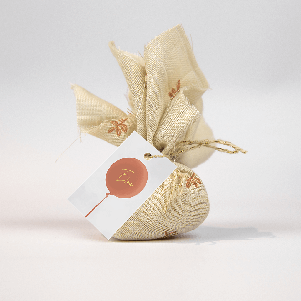 Een vrolijk label bij het geboortekaartje van jullie kleine! Op een grijze achtergrond een oranje ballon met de naam in goudfolie, wat een feest!| Totaalprijs: 0 |
