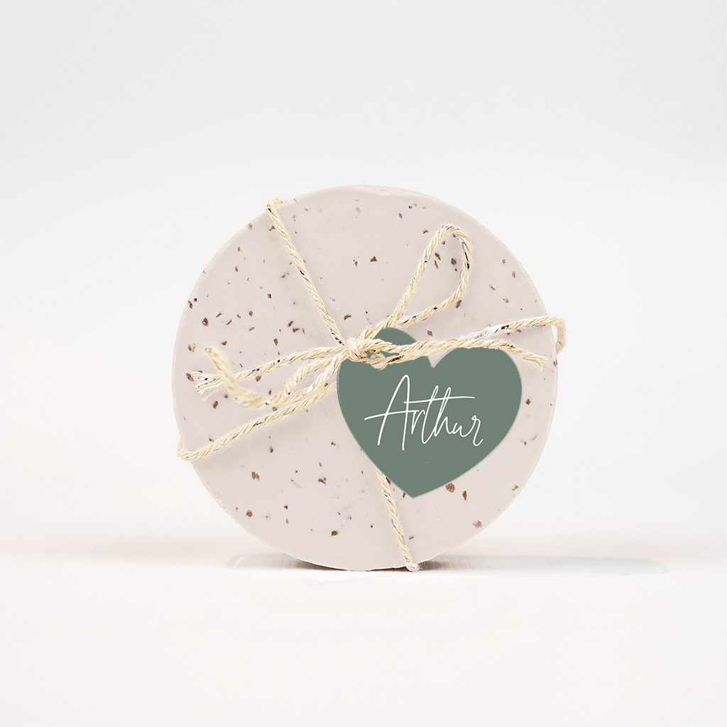 Groen hartjeslabel met witte letters op coated karton, 16 stuks.