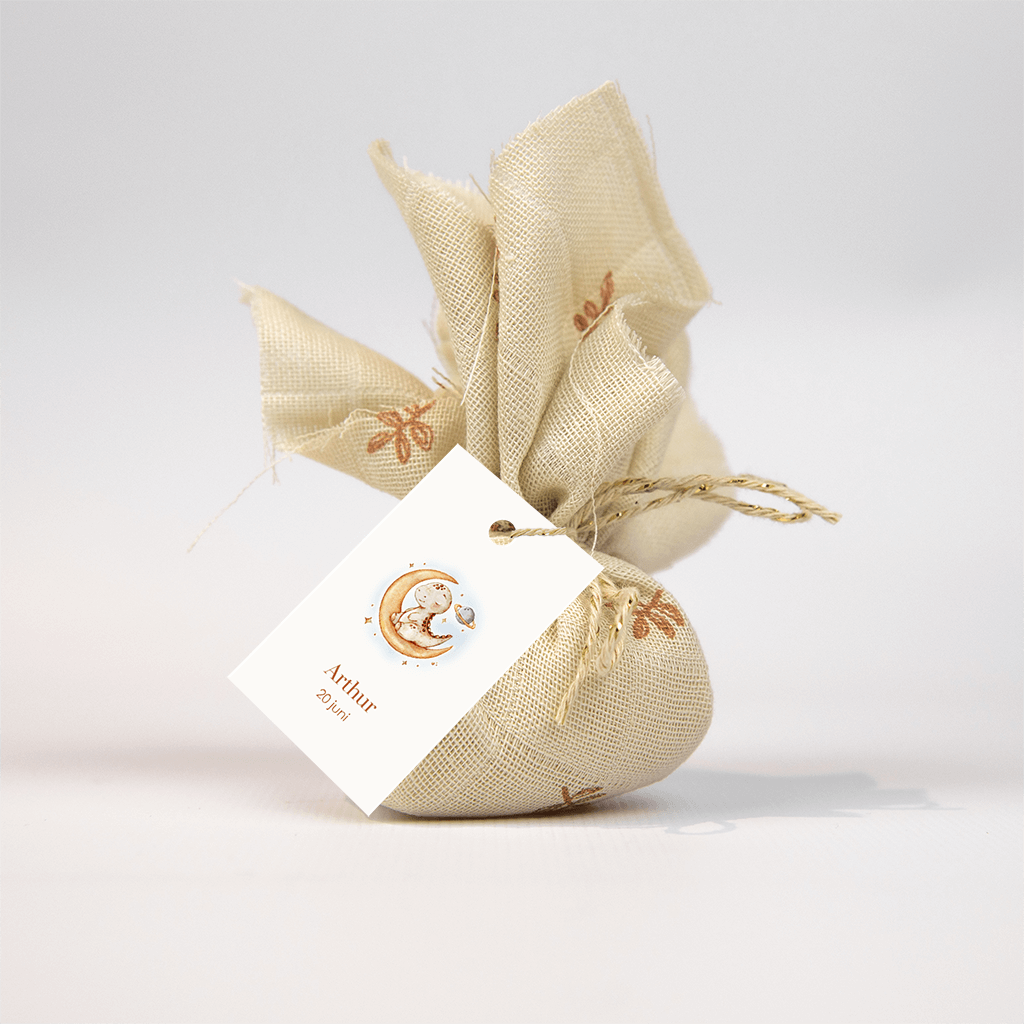 Een label met schattige dino die in de ruimte zit op de maan. Gebruik het labeltje voor aan een doopsuiker of een geboortekaartje.