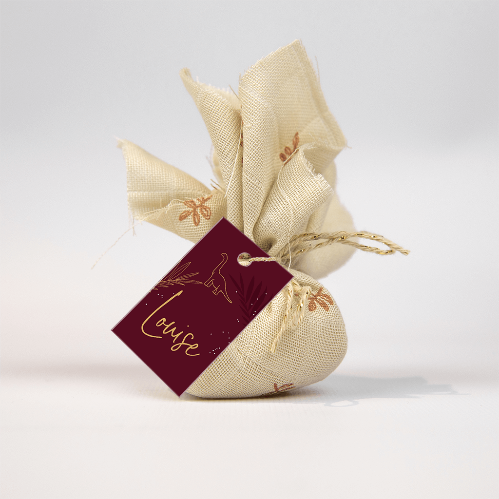 Een stoer labeltje met een donkerrode velvet-look achtergrond voor bij het geboortekaartje of doopsuiker van jullie dochtertje. Op het labeltje staan mooie takjes, een dino en de naam van jullie dochtertje in goud.