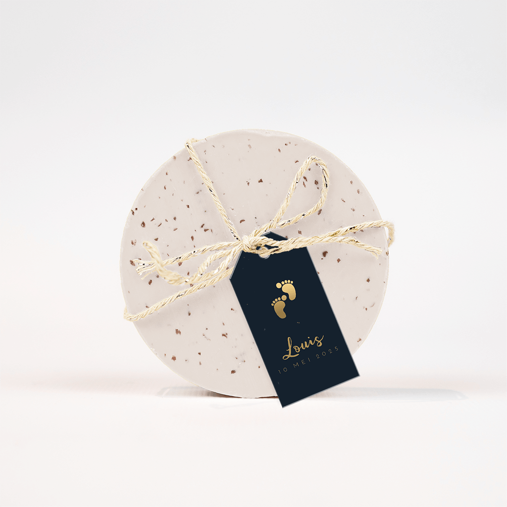 Schattig labeltje met voetjes in goudfolie met een donkerblauwe achtergrond. Afmetingen van de het labeltje is 30x60 mm.| Totaalprijs: 0 |