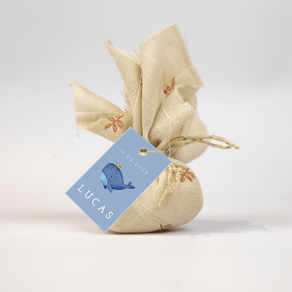 Lavendelblauw langwerpig labeltje voor een jongen met een illustratie van een walvisje in donkerblauw en witte typografie.| Totaalprijs: 0 |