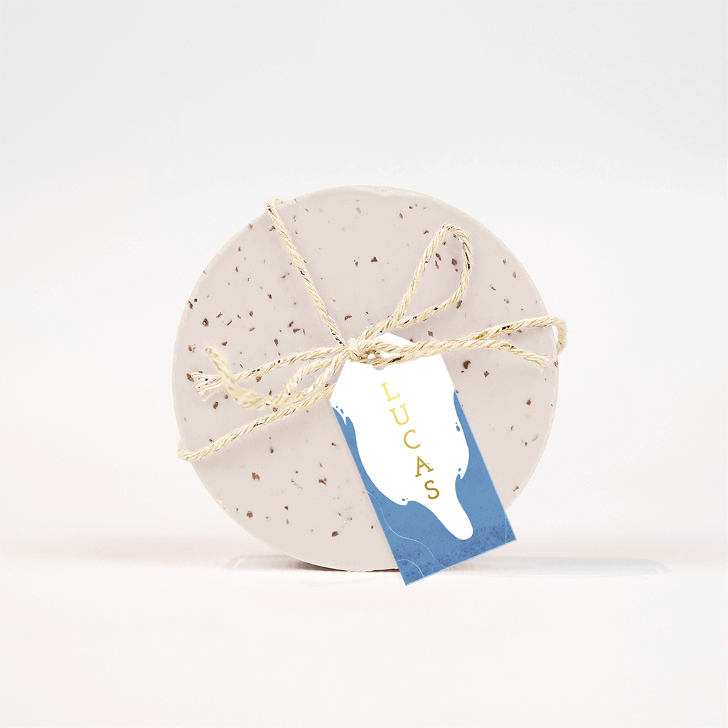 Langwerpig labeltje in wit met een blauw watervlak, de naam staat in luxe goudfolie in trendy letters - 18 stuks per vel.| Totaalprijs: 0 |