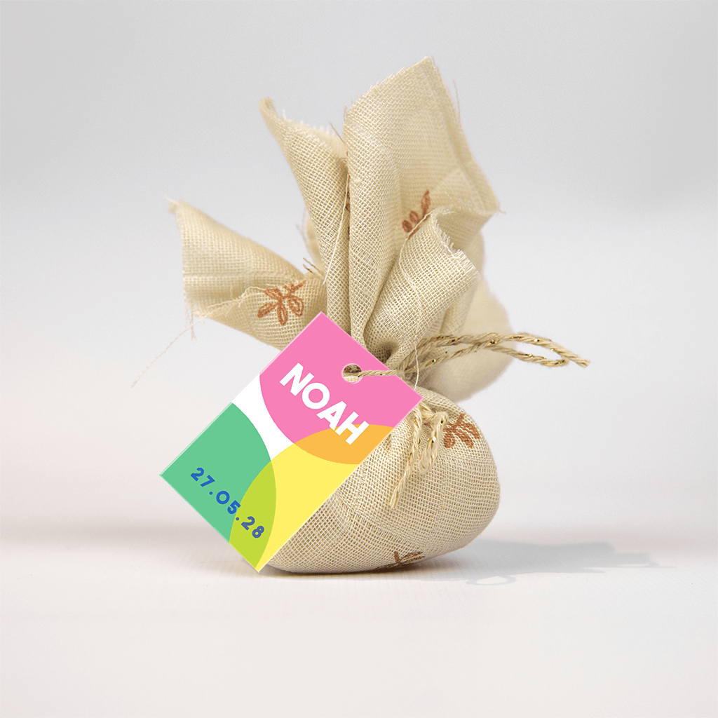 Vrolijk labeltje om je doopsuikers mee te versieren. Pas de kleuren en details aan in de online editor.